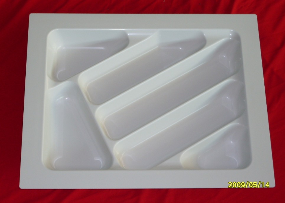 Cutlery tray in food grade HIPS material in low cost and large volume production.